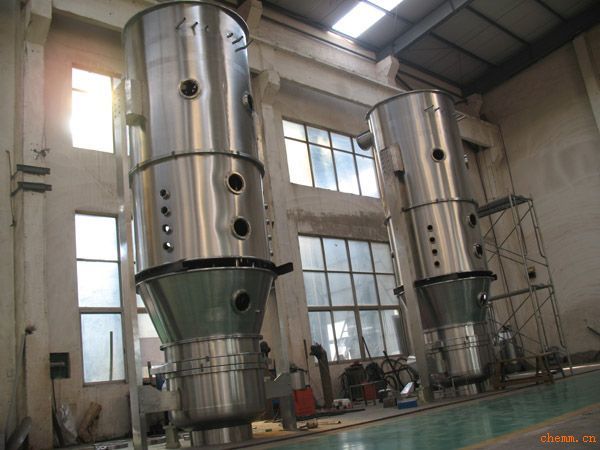 系统风机将新鲜空气从过滤器、加热器入口吸入。经净化、加热后的空气从制粒器下部筛网穿过。高速气流维持粉末物料悬浮,形成稳定的流化床。作为粘结剂的溶液经输液泵压送到喷枪后,象雾一样的喷射到干燥室中的粉末上,使粉末凝聚成多孔状颗粒,粒子形成后,按预定周期在干燥器中干燥,含湿空气经干燥器顶部防静电袋滤器捕集粉尘后排至室外。