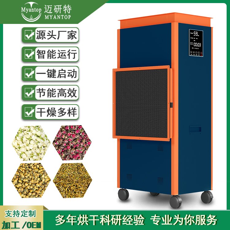 烘干机制热,是依靠大量吸收空气中的免费热能来制热的,消耗少量电能,长期运行,特别省电。而且它无燃烧,不需要消耗任何石化燃料、煤炭等,不会产生氮氧化物、煤灰等废气废物,不会对菊花有二次污染。另外,迈研特设备采用智能显示屏控制,可以精确控制烘干温度、湿度、时间,可以确保菊花在*适宜的烘干环境中进行有效烘干,烘干出来的菊花,良品率高,色质新鲜,保持了菊花的原汁原味,卖相好,售价自然高,经济效益更好。