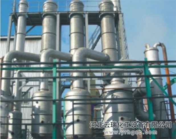 降膜蒸发器是一种高效单程非循环型膜式蒸发设备,多效降膜蒸发器是将料液自降膜蒸发器加热室顶部上管箱进入,经液体分布器、布膜装置,均匀分配到每根换热管内,在换热管内壁呈均匀膜状流下。在膜状流动过程中,被壳程加热介质加热汽化,产生的蒸汽与液相共同进入蒸发器的分离室,在分离室内汽液充分分离,二次蒸汽进入下一效蒸发器壳程作为下一效加热热源(或进入冷凝器进行冷凝),液相则由分离室排出进入下一效直至达到浓度后出料,从而实现多效降膜蒸发操作。