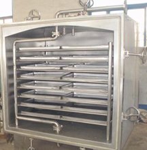 真空干燥箱箱内被散热板分成若干层。散热板中通入热水或蒸汽作为加热介质,将铺有待干燥物料的料盘放在散热板上,关闭箱门,箱内用真空泵抽成真空。散热板在加热介质的循环流动中将物料加热到指定温度,水分开始蒸发并随抽真空逐渐抽走。此设备易于控制,可冷凝回收被蒸发的溶媒,干燥过程中物流不易被污染。