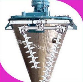 锥形双螺旋混合机的搅拌部件为两条不对称悬臂螺旋;长短各一,它们在绕自己的轴线转动(自转)的同时,还 环绕锥形容器的中心轴;借助转臂的回转在锥体壁面附近又作行星动(公转);该设备通过螺旋的公、自转使物料反复提升,在锥体内产生剪切、对流、扩散等复合运动,从而达到混合的目的。产品可根据要求设计外夹套(加热、冷却),喷雾器,广泛应用于化工、医药、农药、染料、建材等粉体与粉体的混合、反应。 该机根据工艺要求可在混合机筒体外增加夹套,通过向夹套内注入冷热介质来实现对物料的冷却或加热;冷却一般泵入工业用水,加热可通入蒸汽或电加热导热油。