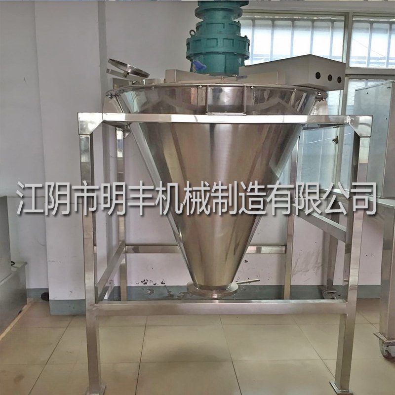 锥形混合机筒内两只非对称螺旋自转将物料向上提升,转臂慢速公转运动;使螺旋外的物料,不同程度进入螺柱,从而达到全圆周方位物料的不断更新扩散,被提到上部的两股物料再向中心凹穴汇合,形成一股向下的物料流,补充了底部的空缺,从而形成对流循环的三重混合效果;标准型锥形螺旋混合机有两根搅拌螺旋,实际应用中根据设备规格大小可以采用单(一根长螺旋)、双(长短各一两根不对称螺旋)、三(两短一长对称布置)根螺旋;理论上搅拌螺旋越多,混合效果越好;设备一般采用梅花状“错位阀”,此阀与长螺旋底部贴合紧密,有效减少混合死角,驱动形式有手动和气动可选;根据用户需要,也可加装蝶阀、球阀、星形卸料器、边出料等。