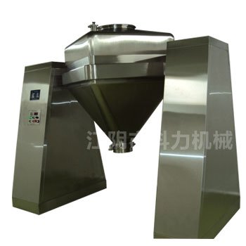 将物料装入方锥形密闭混合桶内,料斗对称的轴线与回转轴轴线成一夹角,不同组分物料在密闭的料斗中进行三维空间运动产生强烈翻转和扩散收缩作用。