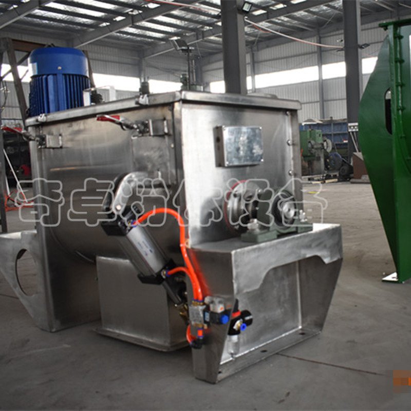 粉体物料采用气动大开门结构形式,具有卸料快、无残余等优点;高细度物料或半流体物料采用采用手动蝶阀或者气动蝶阀。可配置加热或冷却夹套。加热方式有电加热和导热油加热两种方式。冷却工艺可直接向夹套内注入冷却水,夹套换热面积大,冷却速度快。小型号混合机采用减速机直联方式,结构简单,运行可靠度高,维护方便。大型号混合机采用皮带轮带动摆线减速机驱动,皮带传动的弹性连接有在超载时保护传动部件的优势。