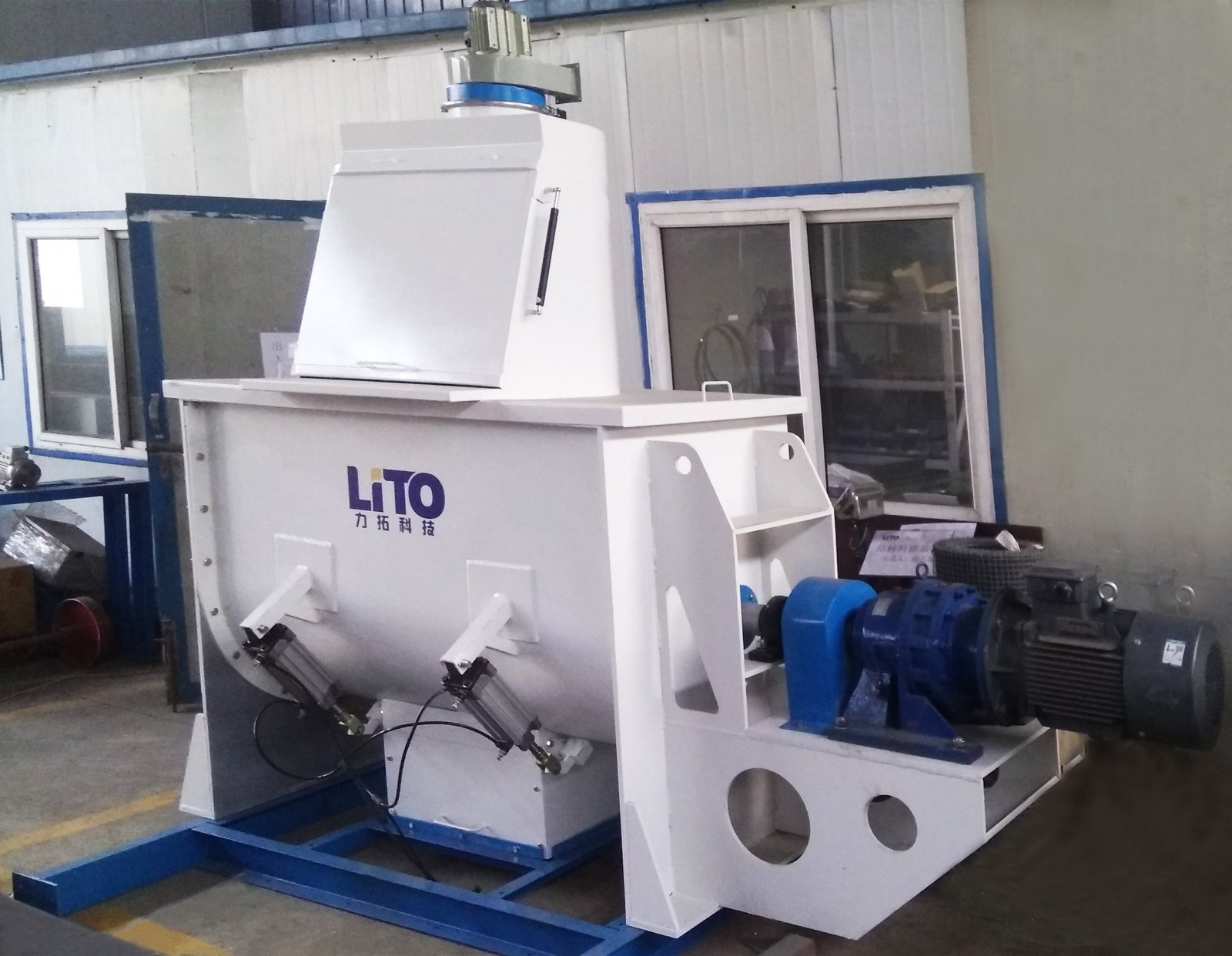 4、卧式双螺带混合机依据实际工艺情况,增加辅助功能组件,如喷液、加热/冷却、等。