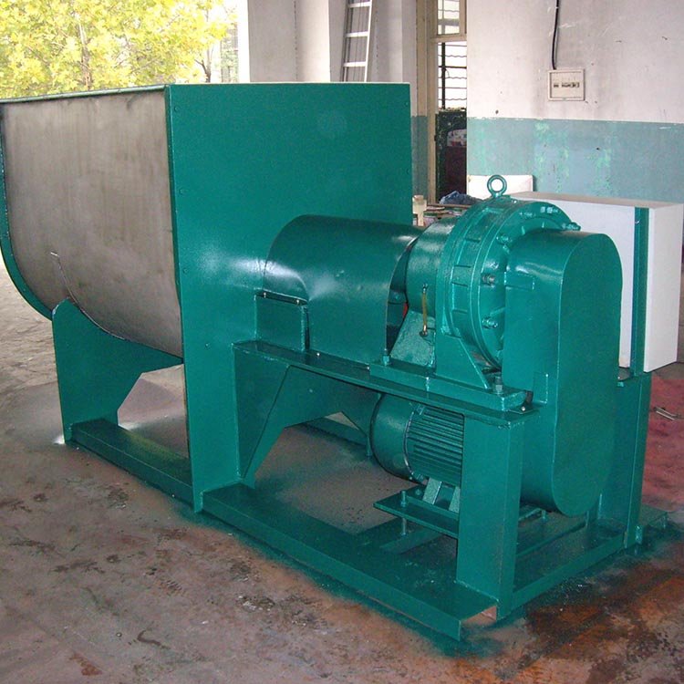 此款混料机为卧式螺带混料机,卧式螺带混料机由安装于搅拌桶内的螺旋杆带动物料翻动,在搅拌器结构上,螺旋设计为内外、左右反螺旋,内外螺旋做轴心运动,带动物料翻转,掺混。完成物料在较短时间内的混合。