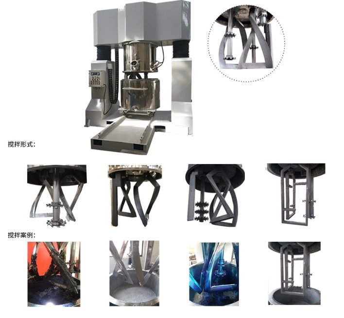 行星搅拌机是一种无死点混合设备,行星架上的活动刮壁和搅拌桨底部的刮低在搅拌时不断的将罐体内壁和底部的物料刮掉,从而保证物料的充分混合;传动部件的机械密封及上下罐体间的软密封使物料可在真空条件下混合,真空度≤-0.096,从而保证物料不致发泡及清除物料中的空气成分;罐体内壁经精车加工,确保刮壁可把罐体内壁上的物料完全刮掉;罐体有加热和冷却两种方式。加热罐体可通过电加热、蒸汽加热及油水循环加热,客户可根据需要选择。釜体上装有温控装置,确保物料温度无误差;采用液压上升下降。