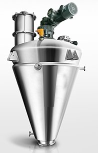 锥形混合机的搅拌部件为一条长螺旋或两条不对称螺旋;它们在绕自己的轴线转动(自转)的同时,还借助悬臂的转动环绕锥形容器的中心轴沿锥形容器的内壁做行星运动(公转);该设备通过螺旋的公、自转使物料反复提升,在锥体内产生剪切、对流、扩散等复合运动,从而达到混合均匀的目的。本机的优点是适用范围广、容积大、出料无残留、节能。