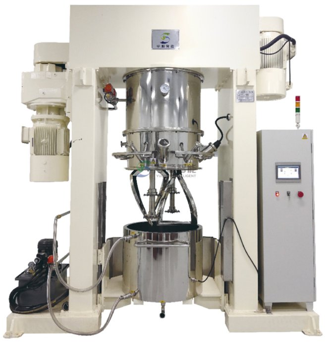 产品介绍:双行星真空动力混合机工作过程中,两支平行的搅拌桨按设定的固定旋转比例运转,沿搅拌桶公转的同时亦快速自转,同时搅拌桶内有随公转同步运转的回旋刮板不停旋转,使物料由搅拌桶内壁移动到搅拌桨附近,搅拌器的运转方向与公转可同向亦可逆向,达到不同剪切目的。另两支单独动力装置的高速分散齿盘亦随公转一起沿搅拌桶内运转,进行分散,乳化,高速分散齿盘为变频调速,可根据生产工艺自定转速。