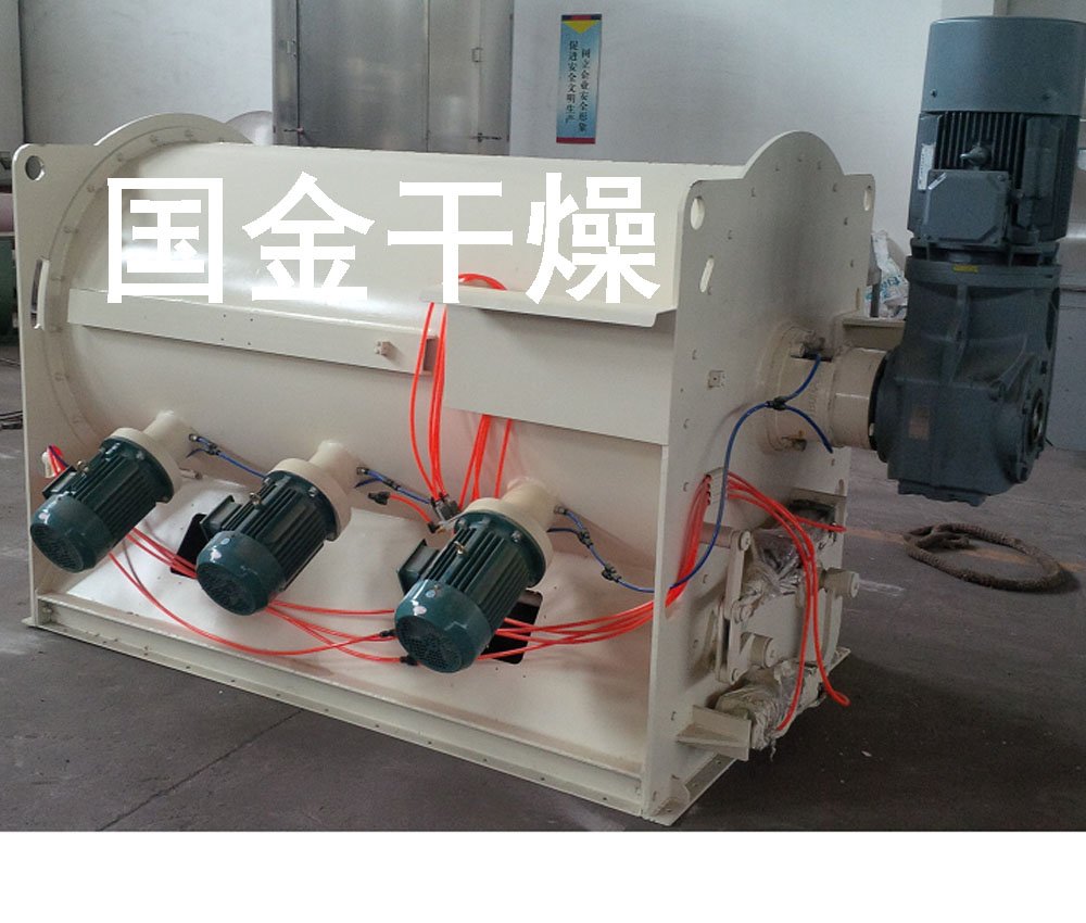 筒体内的犁头,由主电机的减速机带动下,传递犁头组轴旋转,物料沿筒体作径向圆周湍动,同时将物料沿犁刀两侧的方向抛出,另一方面作圆周湍动的物料经飞刀组时,被高速旋转的飞刀搅拌,强劲地抛散。物料在犁头和飞刀的复合作用下不断更叠、扩散,在较短的时间达到混合均匀。对粉料加纤维的分散效果尤其明显,混合均匀度较好。需要固液混合的物料,液体通过喷液装置达到均匀混合。
