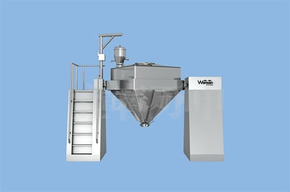 物料通过人工、真空上料、楼层落料或专用提升机进入混合筒内, 料斗对称的轴线与回转轴轴线成一夹角,不同组分物料在密闭的料斗中进行三维空间运动,产生强烈翻转和扩散收缩作用,达到良好的混合效果。