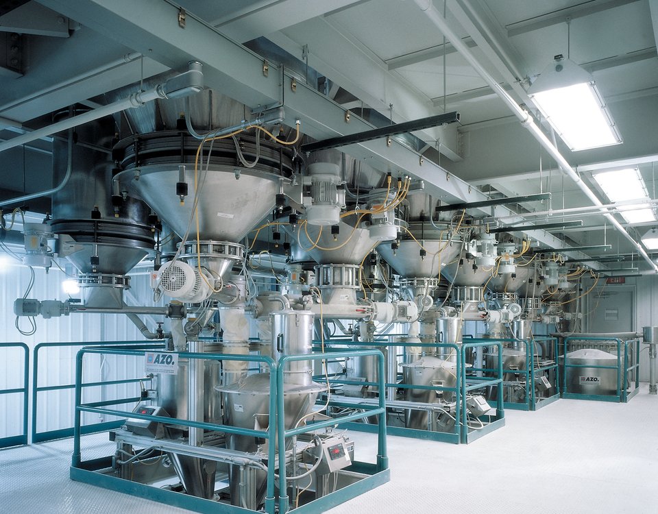 加热-冷却-混合后将干混料排空至混合辅助容器。将其输送至两个AZO匀浆料仓并再次混合,使不同的干混料均质程度更高。通过气动吸送系统从匀浆料仓装料至挤出生产线。