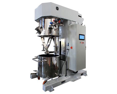 行星搅拌机通 常包含两个搅拌桨叶和两个高速分散一个刮壁桨叶,双搅拌浆和安装于高速分散轴上的多个锯齿状分散盘既作自转,又作公转;同时结合搅拌浆的低间隙设计,无死角,低速搅拌桨强烈的捏合干涉运动和和上下/左右循环运动,以及分散盘的高速剪切打散作用,两个行星搅拌桨叶绕公共轴沿容器壁运转的同时又围绕自身的轴心旋转,桨叶绕容器内壁旋转前进,不断带走容器壁上的物 料,并将物料带向中间,运转一圈后,桨叶已经过了整个容器,3圈后大部分物料已被充分混合,仅36圈后,全部物料就被完全混合均匀,配有真空装置,使物料在混合过程中无空气状态,更好的保证物料的品质