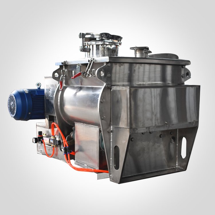 卧式双轴桨叶混合机由卧式W形容器、带(或者不带)开口的顶盖、安装有桨叶并反向旋转的双轴、传动单元、支撑架、密封件、出料结构等部件组成。由于双轴反向旋转,成一定角度的浆叶将物料沿轴向、径向循环翻搅,使物料达到均匀混合的效果。物料在混合器内的上抛运动形成流动层,产生瞬间失重,所以此系列混合机也叫做无重力混合机。