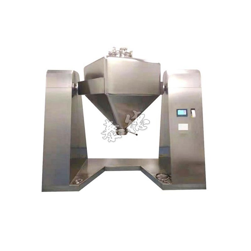 该机由机座,驱动系统,控制系统,混合锥斗等部件组成。工作时将物料装入方锥型密闭混合桶内并锁紧桶盖。料斗与机座回转中心线成30°夹角物料便于形成混合运动。使物料达到混合效果。按设定的转速和时间运行停止后,即可进行分料。