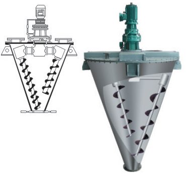 由螺旋的公 、自转使物料在锥体内产生复合运动,主要产生四种运动形式: 1. 螺旋沿壁公转,使物料沿锥壁作圆周运动; 2. 螺旋自转使物料自锥底沿螺旋上升; 3. 螺旋的公 、自转复合运动使一部分物料被吸收到螺旋圆柱面内同时受螺旋自转的离心力作用使螺旋圆柱面内的一部分物料向锥体径向排放; 4. 上升的物料受自身重力作用下降 。四种运动在混合机内产生对流、剪切 、扩散、从而达到快速均匀混合的目的。