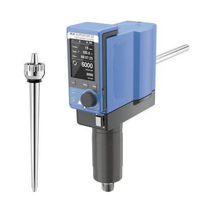 High speed laboratory stirrer designed with a removable wireless controller and a digital TFT display. It automatically adjusts the speed through microprocessor controlled technology within the speed range of 0/150 - 6000 rpm. The stirrer comes equipped with a RS 232 and a USB interface to control and document all parameters, and an update of the current firmware. An integrated torque trend display is provided for the measurement of viscosity changes. The included precision stirrer shaft is 280 mm long and has a maximum immersion depth of 220 mm.