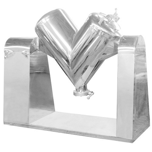 本机一端装有电机与减速机,电机功率通过皮带传给减速机,减速机再通过联国器传给V型桶。使V型桶连续运转,带动桶内物料在桶内上、下、左、右进行混合 V型混合机系列产品为V型不对称混合机,它适用于化工、食品、医药、饲料、陶瓷、冶金等行业的粉料或颗料状物料的混和。该机结构合理、简单、操作密闭,进出料方便,(人工或真空加料)筒体采用不锈钢材料制作,便于清洗,是企业的基础设备之一。