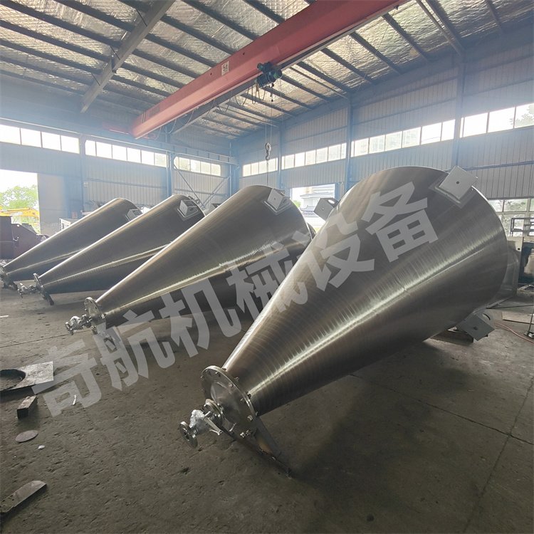 1.锥形混合机产品描述:锥形筒体内安装有沿锥形螺旋线的外圈螺带以及锥形中轴线的内圈螺旋,外圈螺带沿筒壁提升物料,内圈螺旋反向作用,漩涡状的物料流动轨迹,可使物料在短时间内混合均匀。外圈螺带能够全周性的带动物料,在出料过程中,外圈螺带清除贴壁物料,内圈螺旋排出物料。结合倒锥形的筒身,即使流动性差的物料也能迅速出料,且无残留。此型号混合设备适用于流动性能比较差的物料混合。