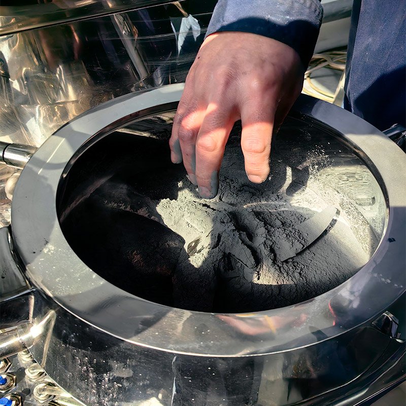 石墨包覆用混合机,包括料桶主体,料桶主体的内部分别设置有**过滤网和第二过滤网,**过滤网和第二过滤网的内侧中央设置有可控阀,**过滤网和第二过滤网的顶端均设置有搅拌旋转叶,搅拌旋转叶的内侧连接有传动杆,料桶主体的底端设置有落料口,落料口的底端设置有传输带,传输带的一端设置有干燥箱,干燥箱的一侧设置有干燥风机,干燥箱的内部底端设置有出料旋转叶,出料旋转叶的底端设置有出料输送台.本实用新型是一种石墨包覆用混合机,该混合机在使用的过程中可对混合物料进行统一分类进行混合处理,同时具有一定的干燥功能,可有效的对内部石墨物料进行干燥处理,提升工艺质量,实用性强.