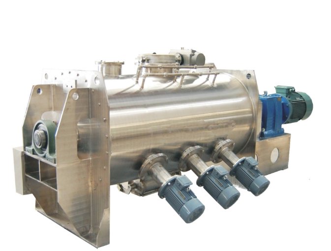 LDH型犁刀式高效混合机由传动机构、卧式简体、犁刀飞刀四部分组成,混合时,机内物料在犁刀的作用下,一方面沿筒体内壁作用向径向端,另一方面又沿犁刀两侧面的线方向飞溅。当物料流经飞刀时,被高速旋转的飞刀强烈抛散,在犁刀和飞刀的复合作用下,使物料不断的对流、扩散、翻动,从而在极短的时间内达到均匀的混合。