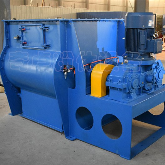 卧式双轴桨叶(无重力)混合机由卧式W形容器、带(或者不带)开口的顶盖、安装有桨叶并反向旋转的双轴、传动单元、支撑架、密封件、出料结构等部件组成。由于双轴反向旋转,成一定角度的浆叶将物料沿轴向、径向循环翻搅,使物料达到均匀混合的效果。物料在混合器内的上抛运动形成流动层,产生瞬间失重,所以此系列混合机也叫做无重力混合机。