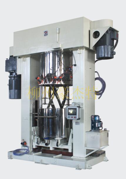 双搅拌桨和安装于高速分散轴上的多了锯齿状分散盘既作自转,又作公转;同时结合搅拌桨的低间隙设计,无死角,低速搅拌桨强烈的捏合干涉运动和上下/左右循环运动,以及分散盘之高速剪切打散作用,保证物料充分分散混合不沉积。