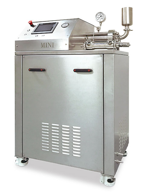 物料流经单向阀后,在高压腔泵里加压。通过微米级的喷嘴,以亚音速撞击在乳化腔上,同时通过强烈的空穴,剪切效应,得到足够小而均一的粒径分布。