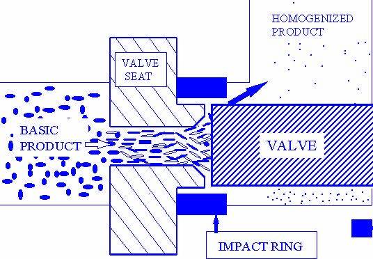 物料在柱塞的往复运动的作用下,输送到一个大小可调的阀组中,受到极强的压缩作用,在通过限流狭缝时,以极快的速度撞击在均质阀,产生空穴效应,撞击效应和剪切效应,使团聚的物料均匀分散。