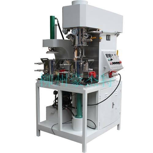 双搅拌浆和安装于高速分散轴上的多个锯齿状分散盘既作自转,又作公转;同时结合搅拌浆的低间隙设计,无死角,低速搅拌桨强烈的捏合干涉运动和和上下/左右循环运动,以及分散盘之高速剪切打散作用,保证物料充分分散混合不沉积。