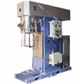 双搅拌浆和安装于高速分散轴上的多个锯齿状分散盘既作自转,又作公转;同时结合搅拌浆的低间隙设计,无死角,低速搅拌桨强烈的捏合干涉运动和和上下/左右循环运动,以及分散盘之高速剪切打散作用,保证物料充分分散混合不沉积。