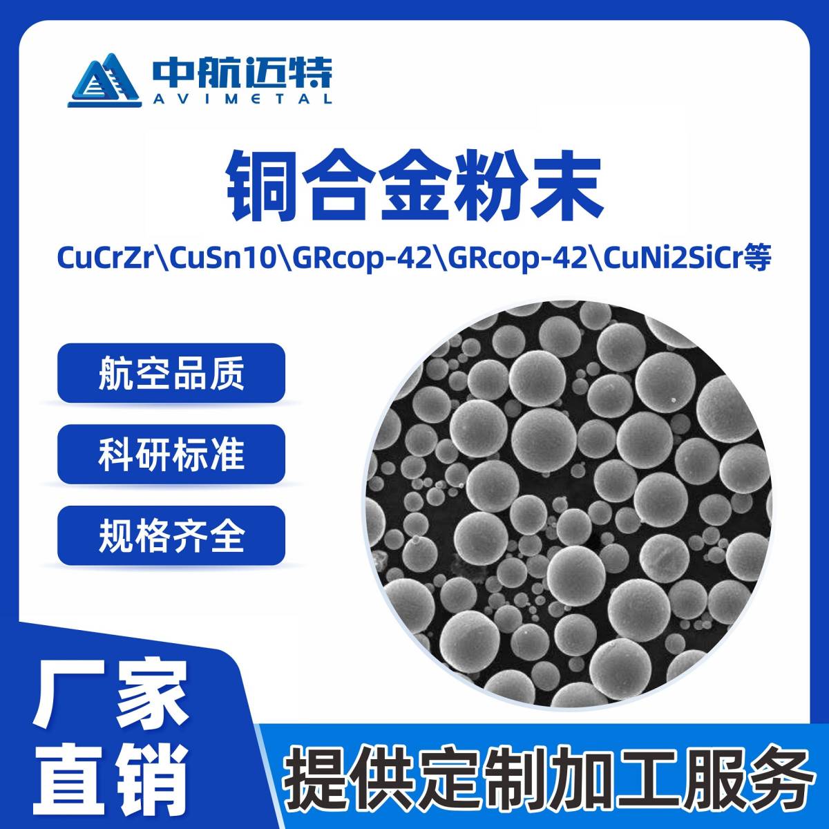 另提供GRcop-84、CuAlNiFe、CuNi2SiCr等多种牌号粉末产品,成分与粒度可定制。