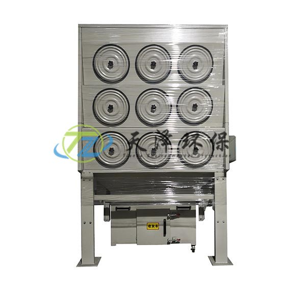 工作原理:完全与脉冲袋式除尘器相同;其不同之处,是利用滤代替滤袋,作为基本过滤元件。含尘空气进入灰斗,分配至净化室,经滤筒除尘后的洁净空气,送至配气点备用;吸附在褶式滤筒外表面的粉尘,在脉冲清灰装置的作用下,清除集尘,落入灰斗,定期排出。