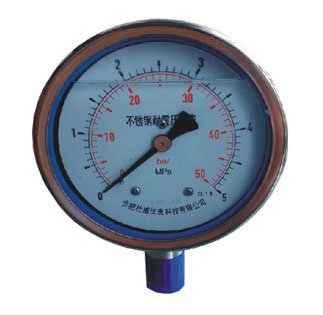 本仪表的整体结构设计合理、工艺精致,具有较高的测量精确度和持久的稳定性,因此不仅可提供出口,尤为国内用户对引进国外先进技术装备中的同类仪表实现国产化的理想配套产品。不锈钢压力表广泛应用于制药机械,石油、化工、化纤、冶金、电站等工业部门对耐蚀、抗振要求较高的工艺流程中测量各种流体介质的压力。仪表由导压系统(包括接头、弹簧、限流螺钉等)、齿轮传动机构、示数装置(指针与度盘)和外壳(包括表壳、表盖、表玻璃等)所组成。外壳为气密型结构,能有效地保护内部机件免受环境影响和污秽侵入。对于在外壳内充液(一般为硅油或甘油)的仪表,能够抗工作环境振动较剧和减少介质压力的脉动影响。