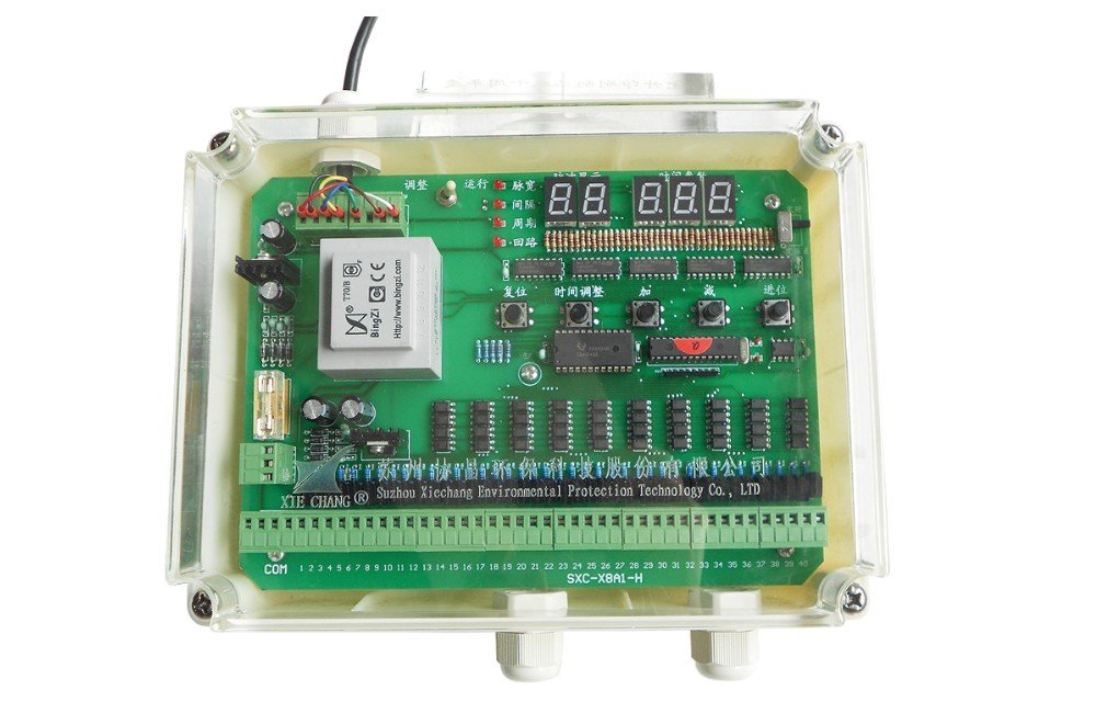 脉冲控制仪是脉冲袋式除尘器进行脉冲喷吹清灰的电子控制器。脉冲控制仪质量的高低反映了袋式除尘器的装备水平。脉冲控制仪每次输出一位的驱动电压,一个驱动电压持续时间,称为脉冲宽度(脉宽);相邻两个输出驱动电压之间的间隔时间,称为脉冲间隔(间隔);控制仪完成对所有位的电磁阀驱动输出所需要的时间,称为脉冲周期,两个脉冲周期之间的停顿时间,称为循环间隔周期(周期)。我公司不断地研究开发,在原有的基础上不断改进,进而推出了X8A1改进型在线脉冲控制仪。