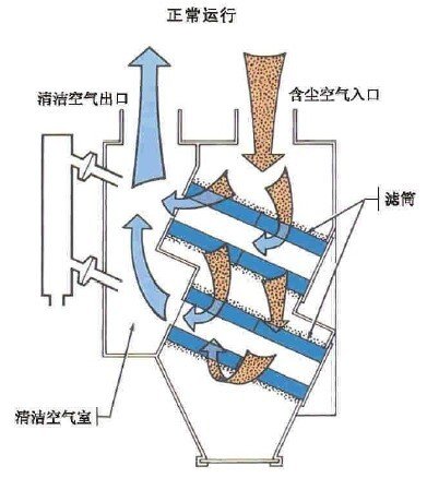 过滤和压差启动清洗:含尘气体在风机的引导下进入除尘器,在一般情况下,含尘气流经过滤筒过滤进入清洁空气室中,然后沿管道进入风机排出干净空气,粉尘被捕集在过滤筒表面,这个过程就像一个高效过滤器工作。