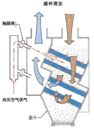 随着滤筒表面的“尘饼”形成,压差将不断增高, 在压差达到一个预定值时,自动脉冲清洗工序开始动作。压差感应器感应到该预定值时令程序控制器启动,控制器给指令电磁阀开启,卸压令气动膜片阀开启,使得压缩空气经过导气管进入清洁空气室。继而此压缩空气进入滤筒,该瞬时气流将滤筒处理的空气有效地截留几分之一秒,压缩空气的瞬时气流继续进入滤筒介质,然后径向将聚集的粉尘吹离滤筒。粉尘则随着主气流的趋势,并在重力作用下向下落入灰斗中。