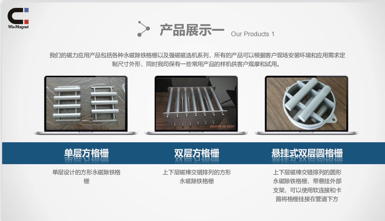 我们的磁力应用产品包括各种永磁除铁格栅以及强磁磁选机系列,所有的产品可以根据客户现场安装环境和应用需求定 制尺寸外形,同时我司保有一些常用产品的样机供客户观摩和试用