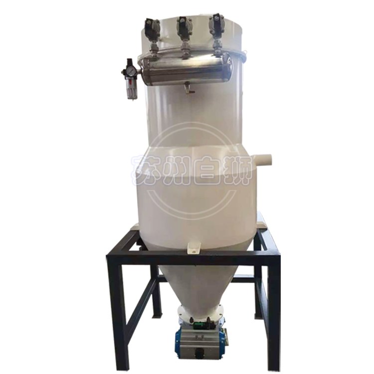 真空上料系统 设备优点:真空上料系统整个输送过程为管道 负压密闭输送,没有粉尘泄漏,污染小,上料速度快,要求原料无粘性。该机使用高压空气反吹,能瞬间震落粉料,使其保持良好之效果;清理容易,无机械性死角,换料快;机体简单,不占空间,移动方便。 真空上料系统和挤出机,注塑机配套使用,全不锈钢制作。使塑料粉末通过密闭管道 输送到挤出机或注塑料机料斗。实现自动加料,能节省人力,降低劳动强度,卫生环保。 结构合理,全部自动化操作,采用PLC控制,产品可靠,稳定。体积小,安装方便。 上料量大,距离高,远。噪音低,动作灵活,操作方便。 节省能耗,料满时自动关闭电源,料不够时自动加料。