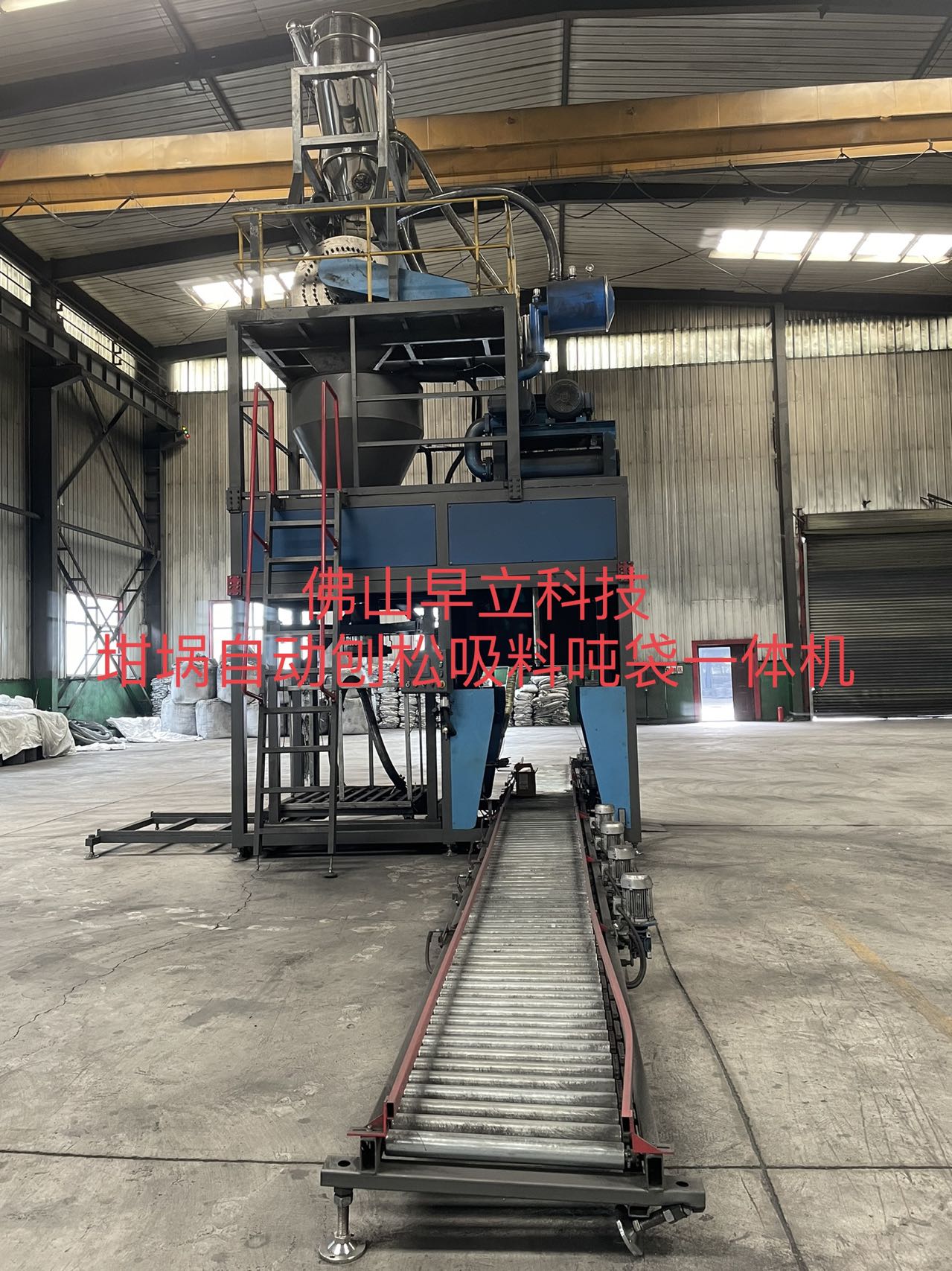 3、1、人工将吨袋挂在吨袋专用吊钩→ 2、人工将袋包与填充口固定,气囊张紧 → 3、缓存仓打开放料、填充头开使往吨袋内填充物料→4、称重传感器读数→5、重量达到后所有动作停止→6、人工脱钩→7、叉车(吊机)转运→填充完成→重复下一个循环