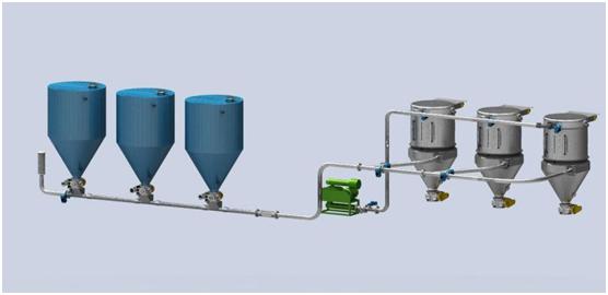 稀相输送的介质一般采用空气或氮气,动力提供一般由罗茨真空泵提供。罗茨真空泵的稀相输送时,物料在管道中呈悬浮状态,输送距离达百米,稀相负压的主要特点是可以从低处或散装处多点向高处一点或多点进行输送,