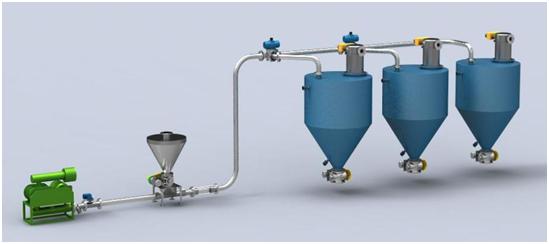 正压稀相输送系统:适用于单点对单点,多点对多点或单点对多点的输送。系统特点:由于系统处于正压,所以密封性要求很高,若有一丝泄漏就会造成粉尘外溢;系统物料采用压送式,所以末端物料容易从卸料口排出,因此末端构造较简单;进料口温度较高,对于一些物料必须做降温处理;罗茨风机作为动力源,压力不能达到很高,故输送距离和产量不能同时取**值。