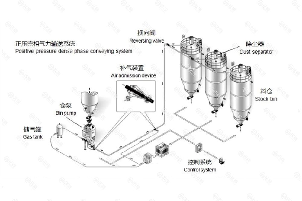 正压气力输送系统也叫压送式气力输送系统,是指利用正压气体对物料进行输送的方式,压送式气体带动物料在管道内运输,在生产工艺中可以实现多种工艺的组合。