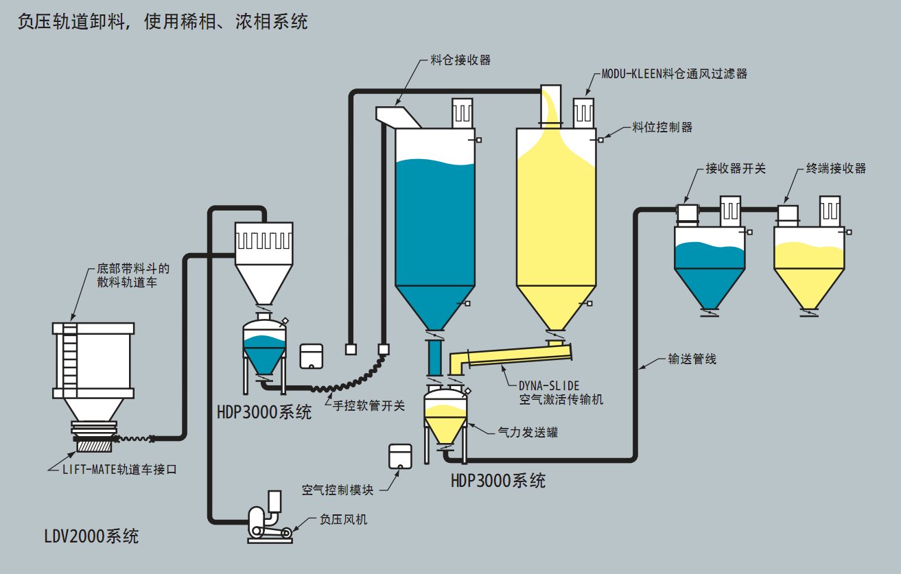 本案例是两套气力输送分别是一套负压稀相与正压浓相系统进行的物料传输