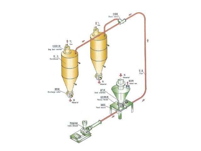 正压气力输送系统就是利用正压气体对物料进行输送的方式,正压气力输送系统也叫压送式气力输送系统,压送式气力输送时将气体输入到供料器内,使空气和物料混合,混合后的气体和物料经过分离器内,物体和气体分离,气体经过除尘装置后排入空气中,物料沉积到料仓中。