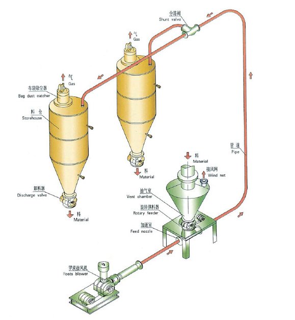 利用安装在输送系统起点的风机将高于大气压的正压空气通入供料器装置中,物料从料斗中加入,在重力作用下进入供料器进行定量进料,料和气一起输送管道到终点的分离器或贮仓内。料气分离后,空气经过过滤后排入大气。