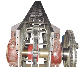 | 工作原理:F U型链式输送机散料各微粒间存在着内磨擦力和内压力,当输送机的输送链及其附件运动时,散料在输送机的机槽内受到输送链运动方向同向的拉力.使散料微粒间内压力增大,从而使散料间内磨擦力增大。当这种内磨擦力大于散料与机槽侧璧的磨擦力时,散料将沿着输送链运动方向向前移动,而增大的内压力保证了散料料层间的稳定状态,从而形成了整体的连续流动,犹如水流一般。(当料层高于机槽高的比值满足一定条件时.料流是稳定的,料速约等于链速。)主要特点:输送能力大:与其他类型的输送机相比,Fu链式输送机具有体积小,输送能力大的优点,它只需皮带输送机1/5的空间或螺旋输送机2/3的空间就能输送相同流量的物料。输送能力达6m3/h- 500m3/h。使用费用低:用合金钢材经科学的热处理加工而成的输送链,其正常寿命大于5年,链上滚子寿命不小于1年(全机*易损件),从而保证年维修量在一次以下,大大降低了使用费用,提高了生产效益。使用能耗低:借助物料的内磨擦力,使运动件所做的功大部分转变为有效功。采用链钩输送大大减少物料对其的阻力,使其能耗仅为螺旋输送机的30%一60%。工艺布置灵活:允许在机壳任何位置选择多种型式的进出口,可高架、地面或地坑布置,可水平或爬坡(≤15°安装)。 |