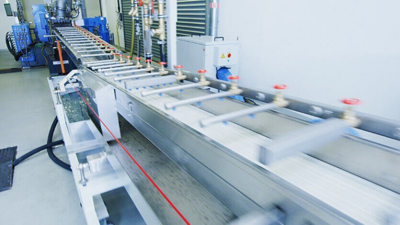 拉条输送系统(SCP)。 两种输送方式都自动的将挤出料条通过冷水槽和下游输送带引入切粒机的喂料口。自动启动装置促进启动操作,系统重新喂入拉条,可避免任何由于断条造成的设备故障。 全自动和半自动输送系统适用于各种材料。他们的锥面连接,可根据加工材料的不同允许拉条处于水槽中的不同位置。此外,冷却段长度和抽离点也可调节。