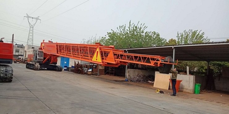 现有的履带式混凝土布料机在运输潮湿的混凝土产品时,混凝土容易在皮带上大量粘结。粘接后的皮带会使得输送困难,影响使用。粘结后如采用人工清理,清理困难。因此我公司设计了混凝土布料机头部清扫装置,解决了皮带粘料的问题。