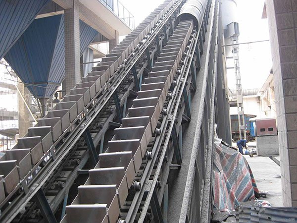 大倾角皮带输送机其结构是在平形橡胶运输带两侧有自由伸缩的橡胶波形立式“裙边”,在裙边之间又粘有一定强度和弹性的横隔板组成匣形斗,使物料在斗 中进行连续输送。挡边带式输送机可广泛用于煤炭、粮食、建材、化工、水电和冶金等部门,在环境温度为-19℃~+40℃范围内,输送堆积比重为 0.5-2.5t/m3的各种散状物料。对于输送有特殊要求的物料,如高温、具有酸、碱性、油类物质或有机溶剂等成分的物料,需采用特殊的挡边输送带。